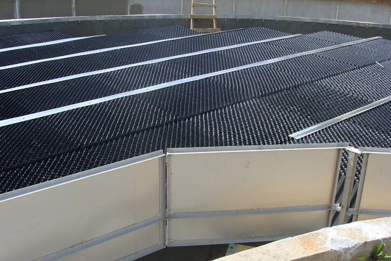 La surface étant épurée au moyen de plaques ou de tubes modulaires dans ces bassins, l’efficacité de sédimentation est plus élevée et le bassin occupe moins d’espace. Afin d’éviter le colmatage entre les plaques, l’inclinaison des plaques doit être d’environ 60° et la distance entre les plaques doit être de 50-60 mm. Toutes les conditions d’écoulement doivent être remplies pour assurer un flux stable de particules à travers les plaques vers le bas.